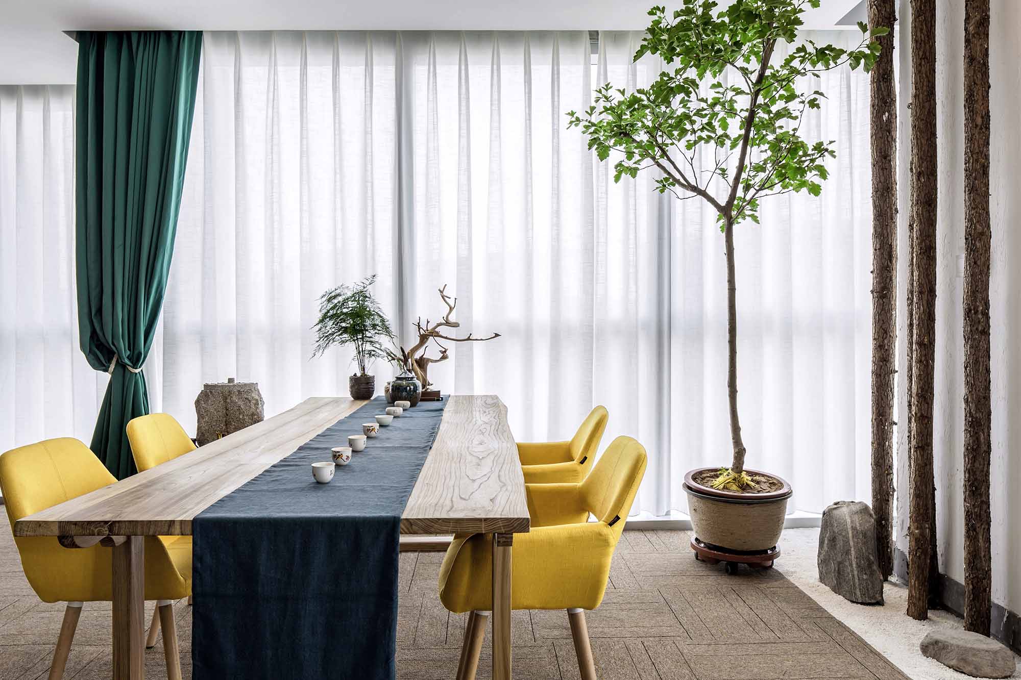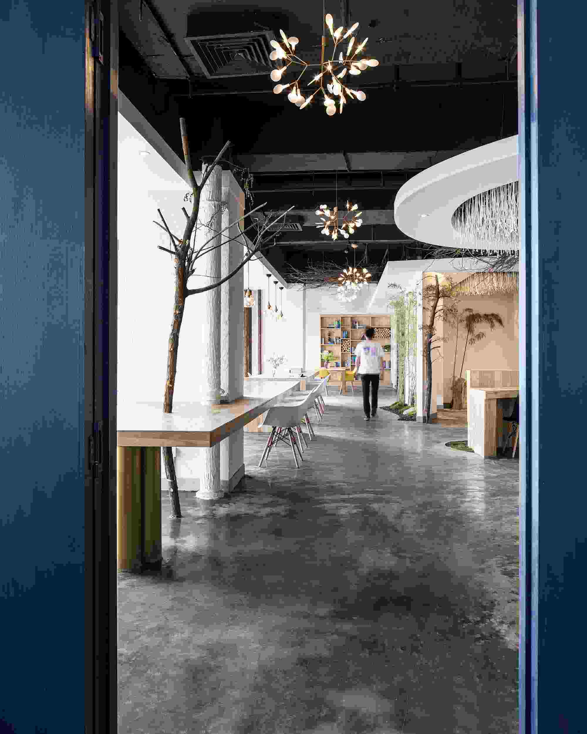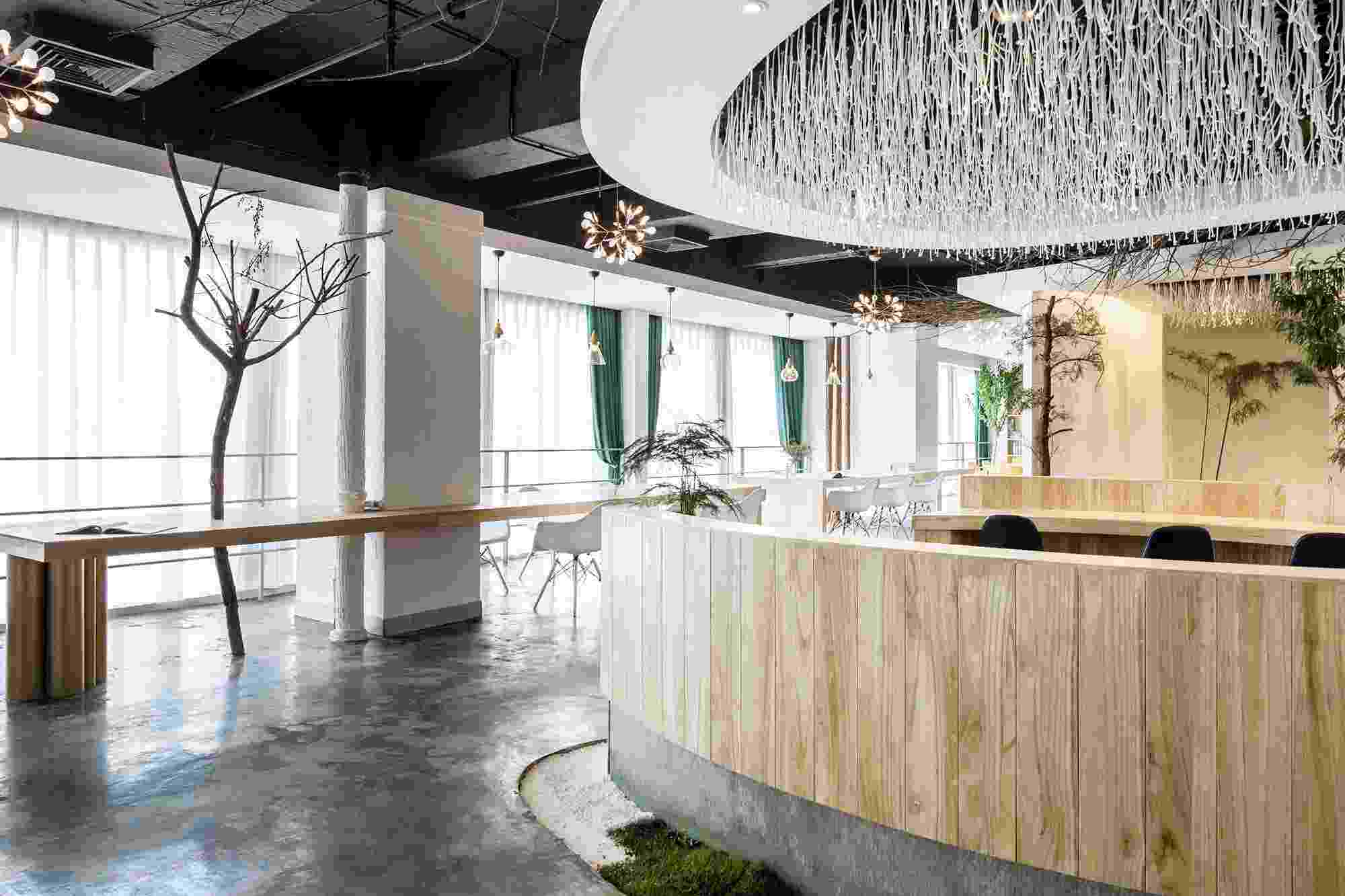 東方的美學(xué)向來是含蓄溫婉的,LOGO墻處的玻璃透景配合自然的竹石,隨著太陽的變化,光影也在不斷的變化,猶如人生。在材料的運(yùn)用上選用的都是一些環(huán)保低碳的天然材料,如樹枝、石竹、枯木、天然原木板,地面則是采用了水泥自流平的方式。