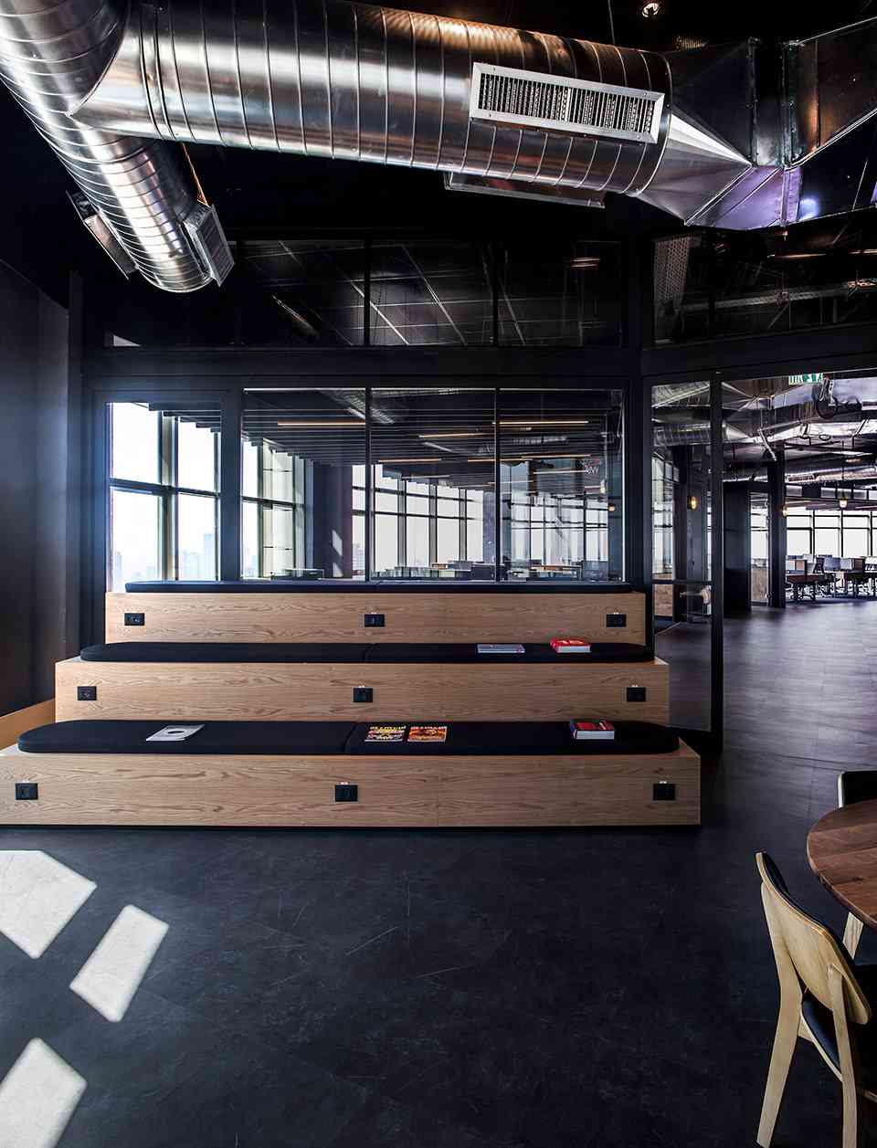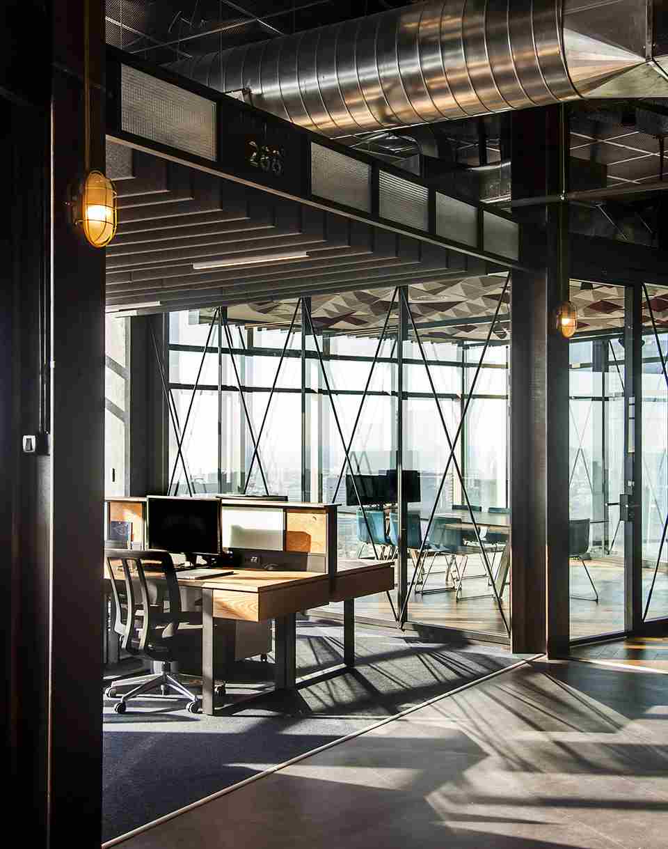 粗糙的原木、不加修飾的混凝土核心筒墻體以及銹色的金屬結(jié)構(gòu)凸顯了這個辦公空間的工業(yè)氣息?!扒擅畹卦O(shè)計讓位于城市中心的辦公空間能夠與公司所有數(shù)據(jù)的來源 – 船只發(fā)生了聯(lián)系。我們有意避免了讓人能夠聯(lián)想起豪華游艇的任何元素,而是渲染出一種如同工業(yè)港口般的粗糙氛圍?!笔聞?wù)所創(chuàng)始人Roy David解釋道。