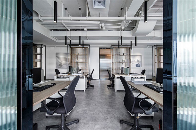 1、極簡(jiǎn)風(fēng)格550平辦公室設(shè)計(jì)案例:空間的形式做到了極簡(jiǎn),沒(méi)有任何多余裝飾,橡木豎向格柵、乳膠漆墻、半透明玻璃移門(mén)、平頂天花、開(kāi)放式天花、橡木飾面的柜子及門(mén)扇概括了所有的造型。通過(guò)這些簡(jiǎn)單的形式,以營(yíng)造出通透流暢的空間,空間可以通過(guò)格柵門(mén)及玻璃門(mén)開(kāi)放或密閉,從而滿(mǎn)足不同的使用需求。豎向格柵使得空間具有了多層次的穿透與流動(dòng),讓路徑串聯(lián)的每一個(gè)獨(dú)立空間可以借由半透明玻璃門(mén)產(chǎn)生視線(xiàn)上的交叉,而視覺(jué)的穿透還保證了空間的連續(xù)性。走廊和辦公區(qū)用格柵書(shū)架作為隔斷,整齊疊放的書(shū)籍與辦公桌上的植物使辦公環(huán)境更加輕松舒適。