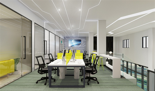3、550平科技辦公室設(shè)計(jì)裝修:空間分成兩層,為了更好的滿(mǎn)足甲方的各種需求,設(shè)計(jì)師利用部分硬裝造成一種空間上穿插的效果,達(dá)到視野上的開(kāi)闊性。色彩上面以客戶(hù)要求表現(xiàn)活力(綠色調(diào))為主,再以色彩上的搭配,營(yíng)造出一種賦予有生命力、活力、五彩斑斕的公司。再配以展示電子產(chǎn)品技術(shù)為主題的設(shè)計(jì),達(dá)到客戶(hù)想要的效果及體驗(yàn)。