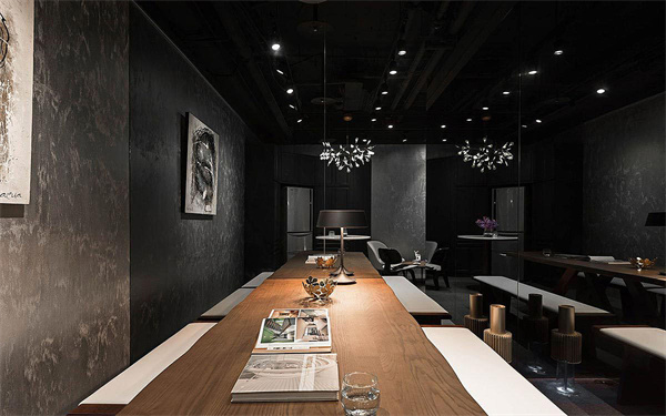 2、現代風辦公室茶水間裝修設計:壁面刷上特殊漆,利用手繪的溫度創(chuàng)造視覺層次,結合主燈及點狀燈的光影烘托,**提升空間質感。此外,茶水間內部除了擺設圓桌、跳色單椅外,更安排了一張木質長桌,增加座位席,同時亦為空間注入溫潤感受,更運用收納高柜將各式電器藏于立面中,辦公室設計師巧手將坪效發(fā)揮得****,打造宛如VIP等級的休憩空間。