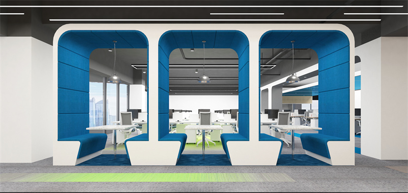 2、在辦公室裝修中不同的顏色會帶給人不同的心情,淺色、藍(lán)色可以使人產(chǎn)生放松感。藍(lán)色很容易讓人安靜下來,它代表著寧靜,也有研究表明人的身體處于藍(lán)色的房間能夠放松神經(jīng),在輕松安靜的環(huán)境中辦公是非常舒適的,因此藍(lán)色也是辦公室設(shè)計中常用的顏色。