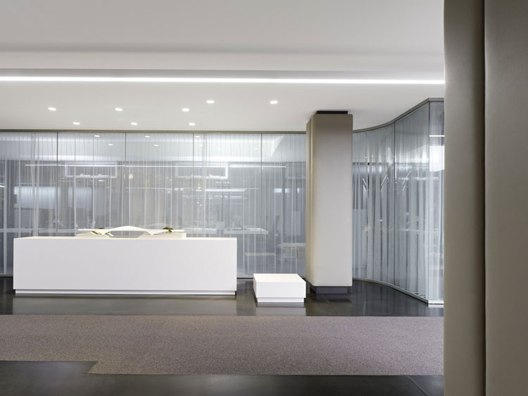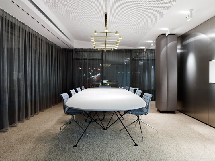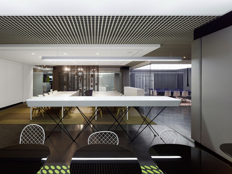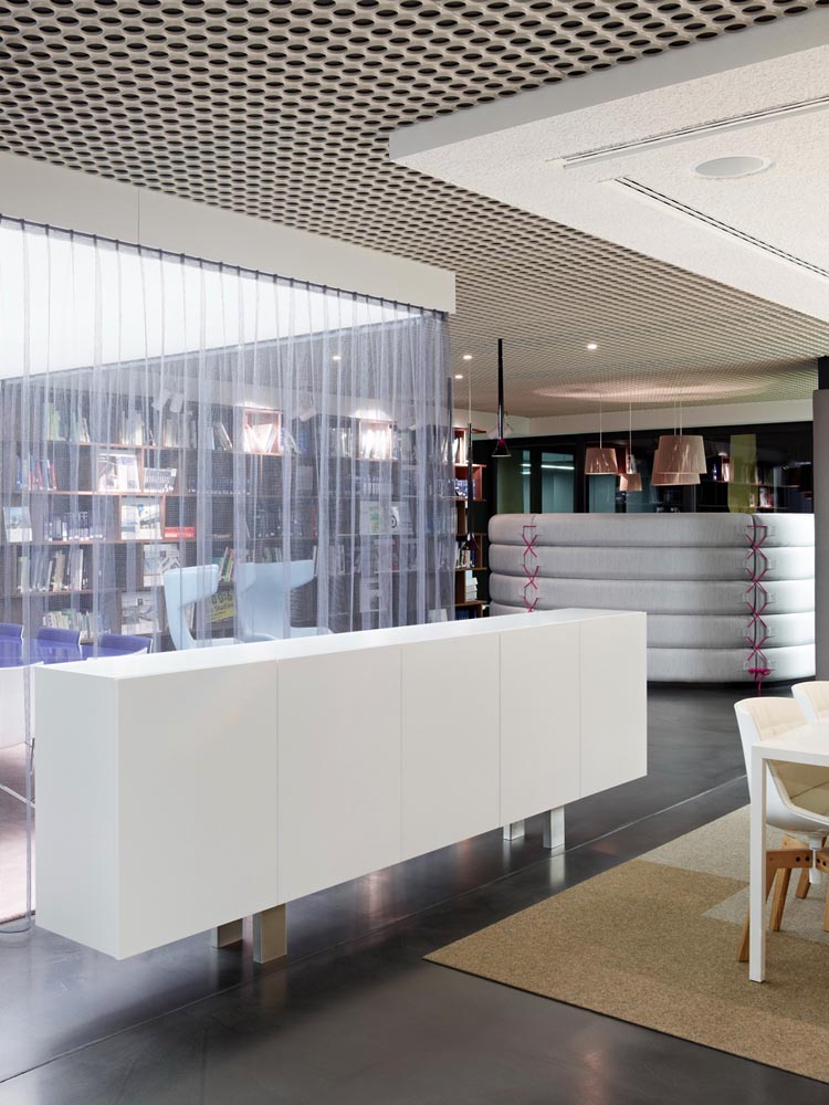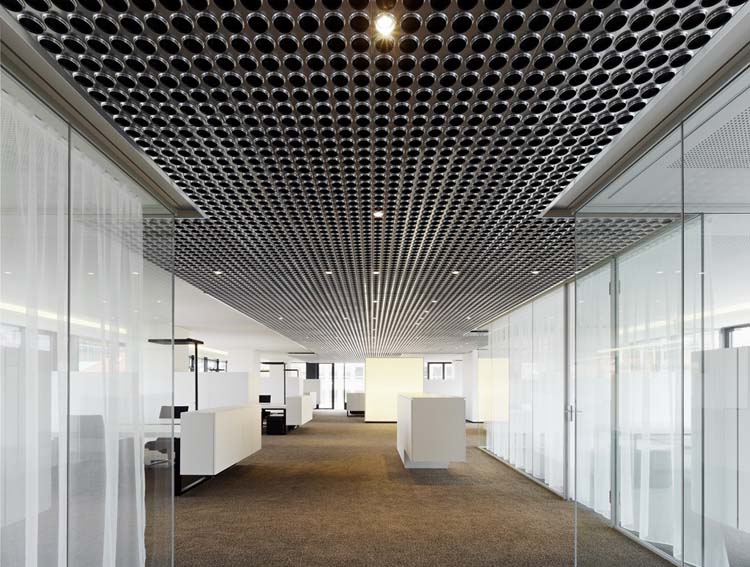 其概念是設(shè)置一個(gè)為所有部門共用的交流空間,以及滿足不同協(xié)作需要的不同分區(qū)。原先單獨(dú)、分散化的辦公室變成大型開放式的辦公空間,鼓勵(lì)同事之間的交流。每一個(gè)樓層都有單獨(dú)的辦公室和單獨(dú)的工作組空間,以及大型開放式工作間。各個(gè)工作站的工作人員能夠相互交流。玻璃立面的辦公室中,十字形的結(jié)構(gòu)將開放式的空間分隔為各個(gè)單元,但又是集中的工作環(huán)境。一系列暖色調(diào)的材料營造出不同的氣氛,有時(shí)候讓員工感覺到像在家里一樣。辦公樓中的地毯有著清晰的路徑指示和功能分區(qū)。就餐區(qū)地板上的綠點(diǎn)如同變魔術(shù)一樣變出草地的效果,構(gòu)筑起通向露臺的一道概念式的橋梁。向露臺打開的半圓形裝飾空間與其他部分區(qū)分開來,透明的蕾絲幕布構(gòu)成了半私密的空間,而清新的色彩、深藍(lán)色的桌子和粉色的地毯,無不為員工帶來激發(fā)工作情緒的氛圍。